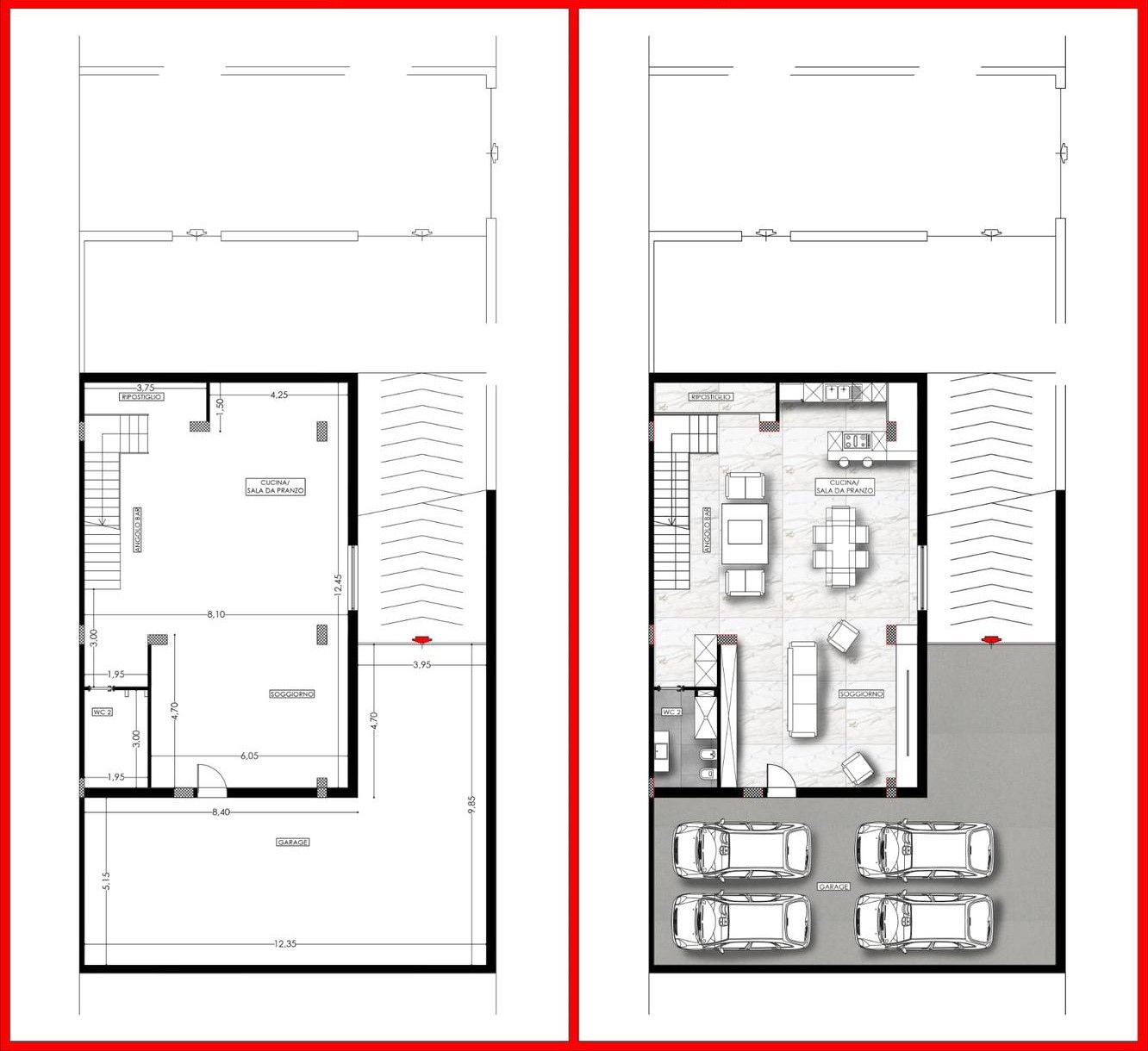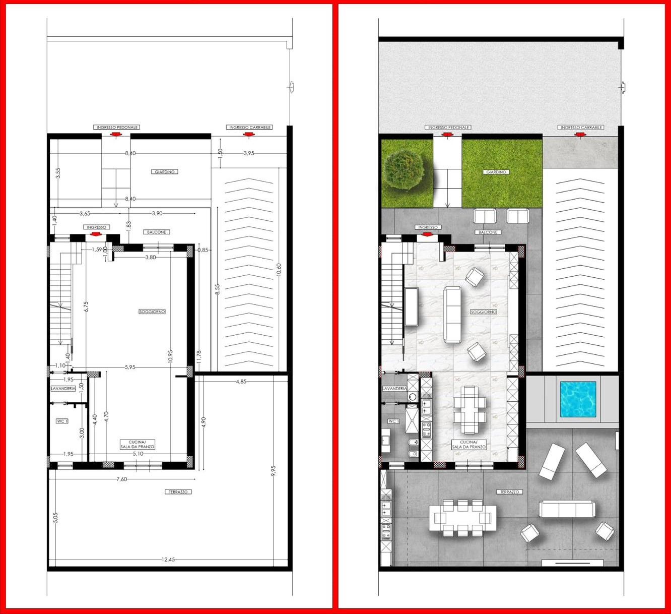 Piano rialzato: zona giorno con ampio salone/cucina in open space, bagno e accesso diretto alla corte esterna esclusiva di circa 150 mq, divisa in giardino frontale e terrazzo posteriore. Predisposizione per cucina esterna, angolo TV e piscina.