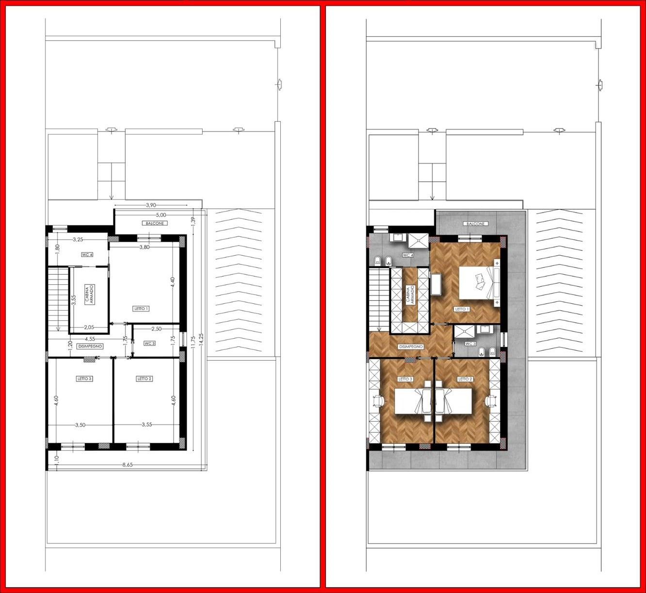 Piano primo: zona notte con camera matrimoniale con cabina armadio e bagno privato, due camerette, secondo bagno e balconata perimetrale che rende gli ambienti molto luminosi.