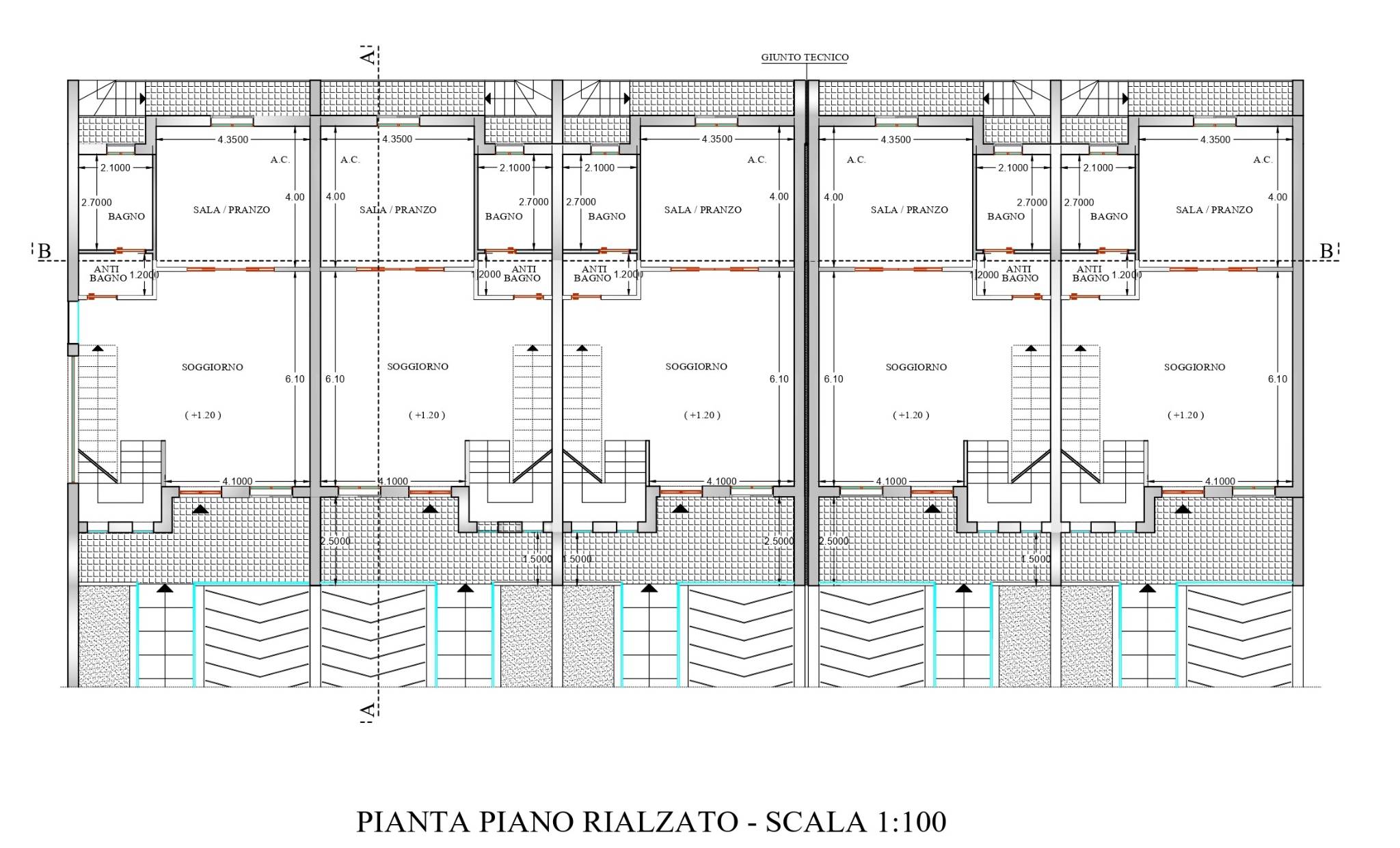 Piano Rialzato di mq 75: ampio salone con cucina living che affaccia su terrazzo e giardino, completano il piano un ampio bagno e una lavanderia;